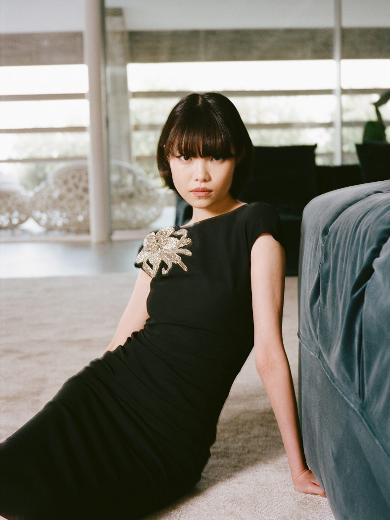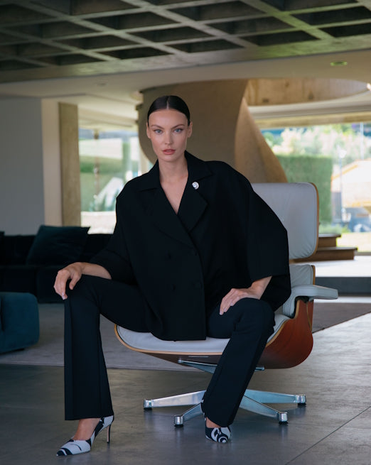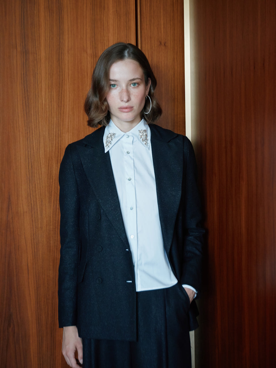 Accessories are not just details, they are the true stars that transform a total black look or elevate a minimalist outfit. From stretch jersey flower brooches, perfect for enhancing and completing a suit, to jeweled brooches that catch the light and add a sophisticated twist, every piece speaks of contemporary femininity.