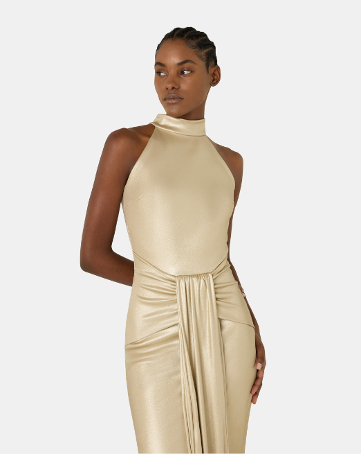 For a more traditional and elegant ceremony, choose a long dress. If you want to look chic without compromising on comfort, opt for a flowing gown with a chiffon cape, such as the pastel-toned, perfect for embracing the season’s trends.