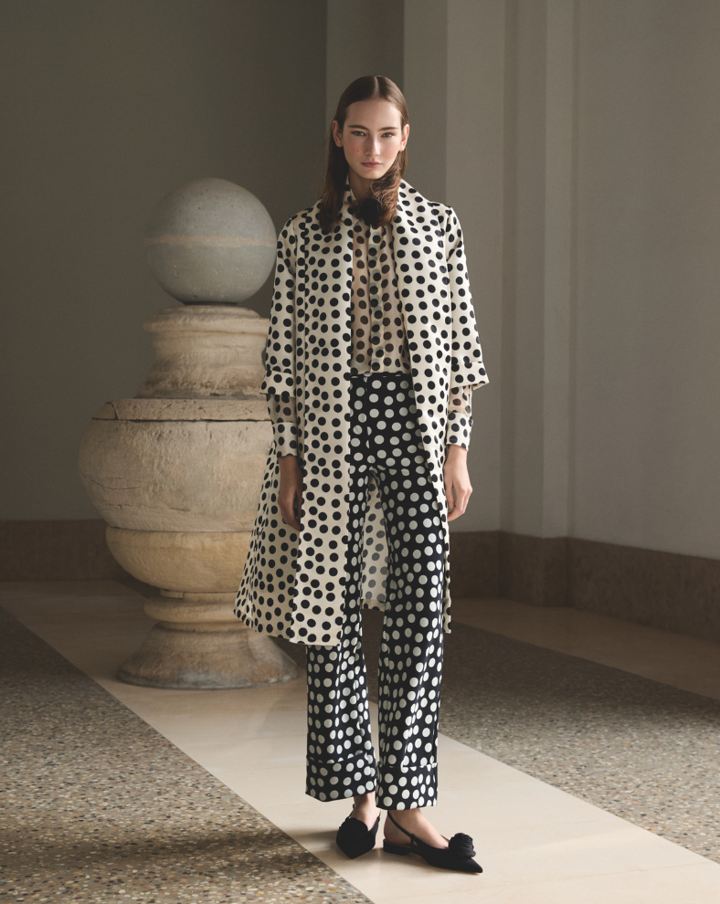 From day to night, polka dots shift in character without losing their iconic identity: in structured suits, they convey contemporary elegance, while in fluid, long dresses, they open to a more sophisticated realm, ideal for special occasions. Tailored cuts and carefully calibrated proportions amplify their versatility.