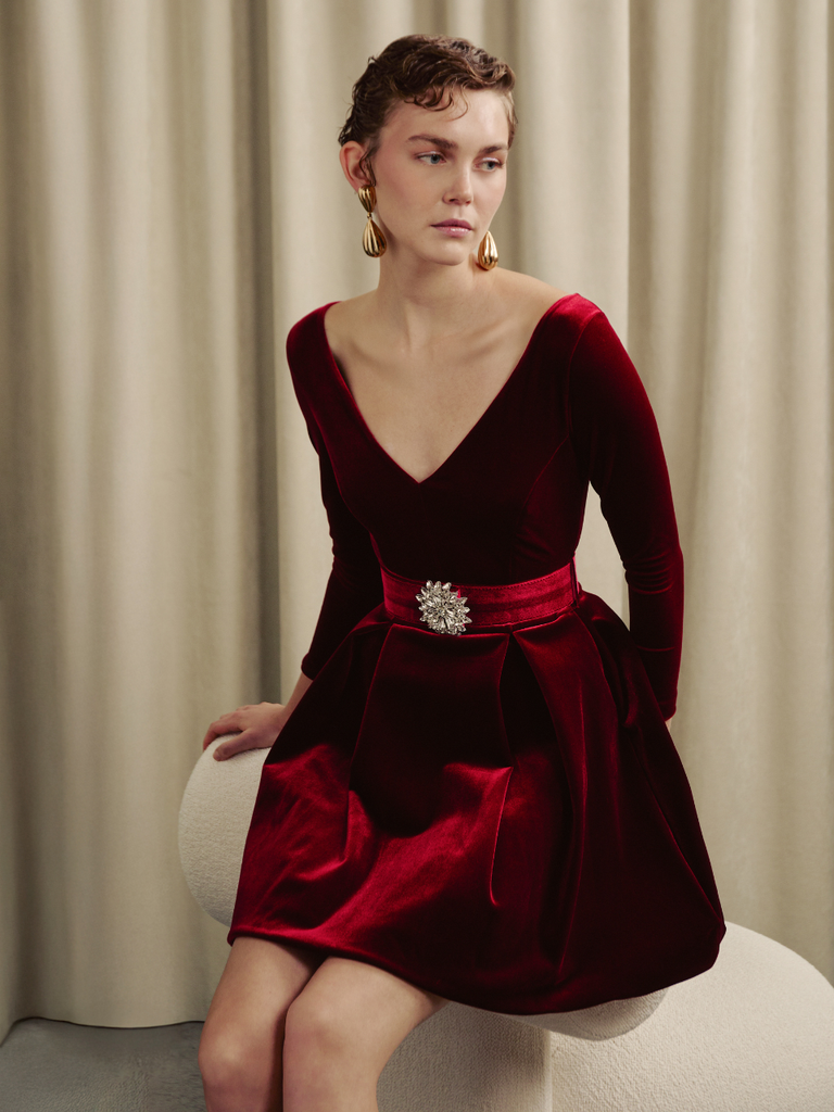 For a more romantic allure, velvet unfolds into soft volumes and luminous accents: the balloon-skirt dress with a jeweled waist detail in intense Garnet velvet offers a dramatic yet decidedly contemporary elegance.