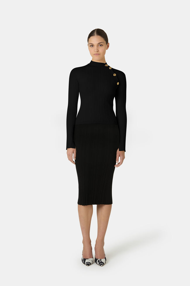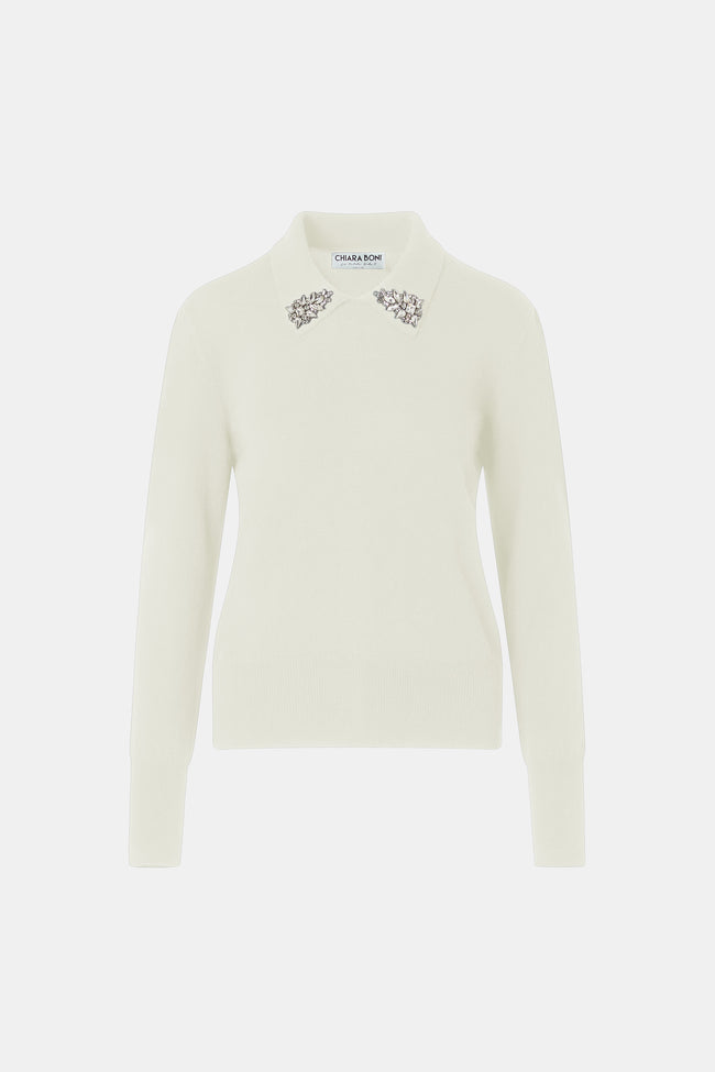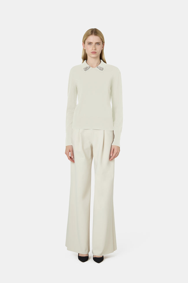 The enveloping atmosphere of the Fall/Winter 2025 collection is also reflected in the knitwear selection, featuring sweaters and dresses in soft cashmere blends, as well as styles with lace effects or bouclé textures, enriched with elegant details.