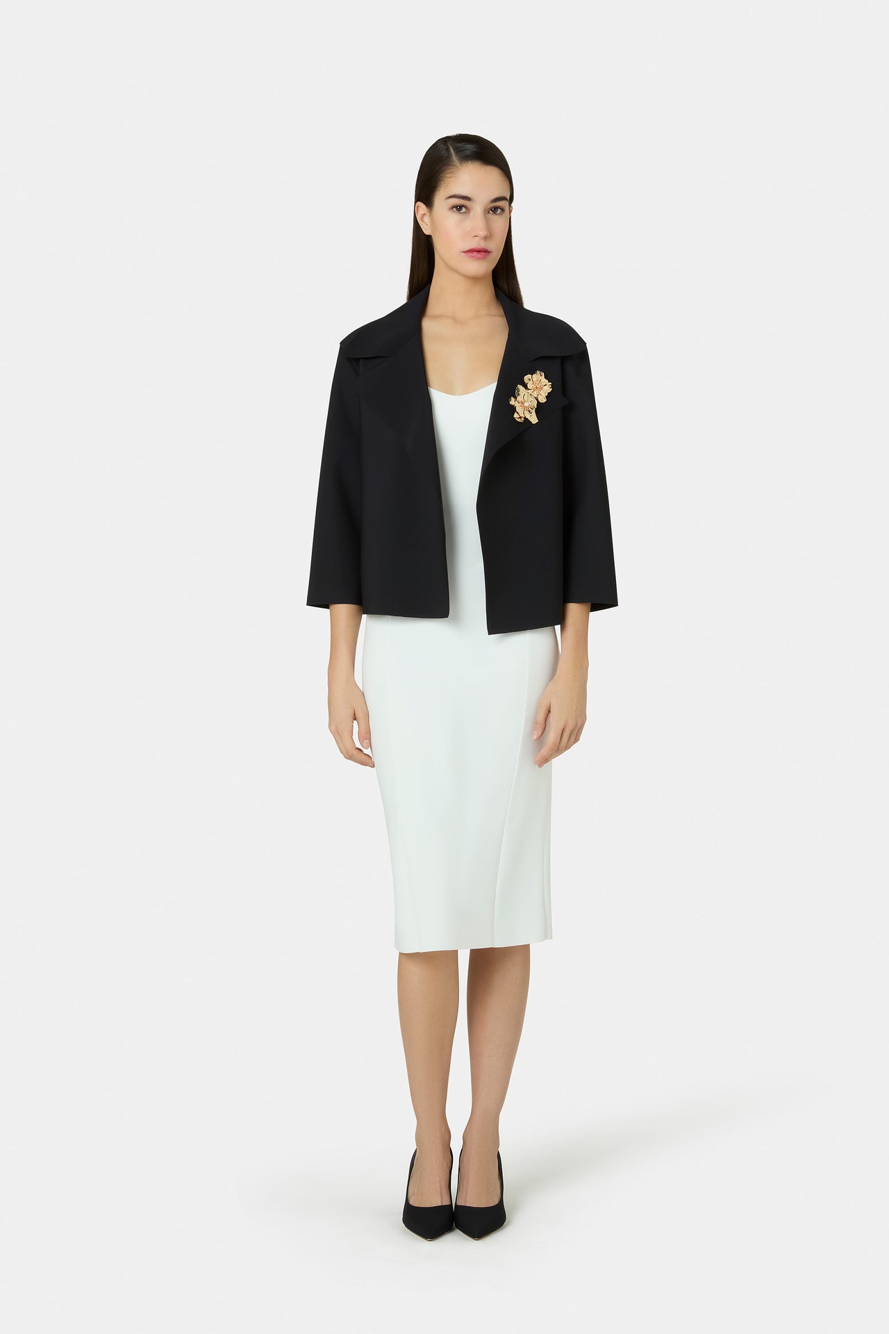 Vintage jewelry influences refined embellishments throughout the collection, with brooches and metallic embroideries illuminating gathered dresses, structured shirts, and graphic gowns. Florals blossom from vivid maxi motifs with yellow highlights to delicate degradé prints on fluid satin, while voluminous taffeta gowns, textured lace, and playful 1940s‑inspired polka dots add depth and couture attitude. Daywear expands with polished cotton suiting, ribbed viscose dresses, and soft cashmere‑silk knits enriched with signature jewelry details. Accessories complete the look: pointed pumps, mules, and slingback flats in matte and metallic jersey—many adorned with removable flowers—alongside the Grace mini bag and the draped Capri clutch, for a confident, contemporary expression of femininity.