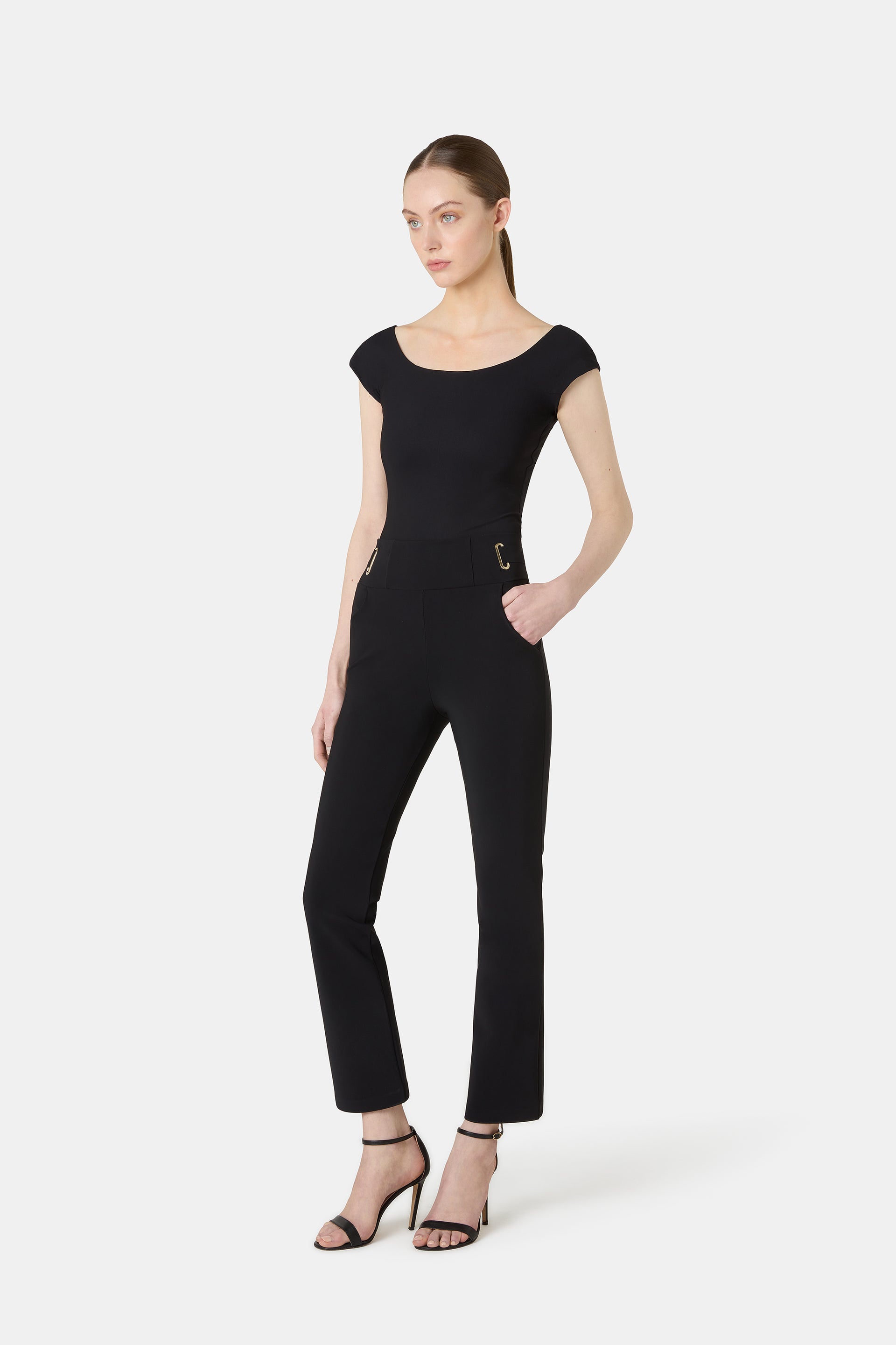 CHIARA BONI's pants are known for their impeccable fit and comfort. Introducing the Damia pants, in a new slim, ankle-length silhouette. An illusion belt at the waist is outlined by metallic loops.