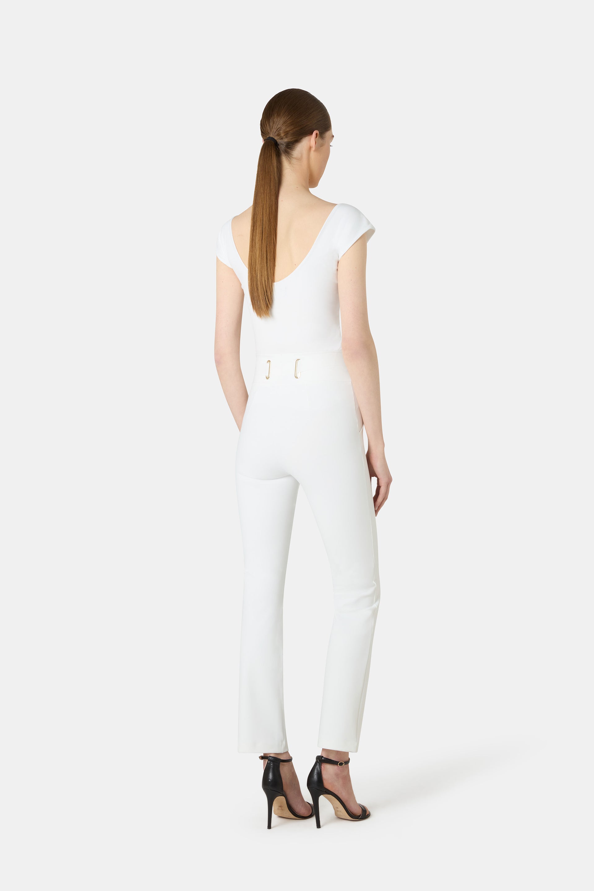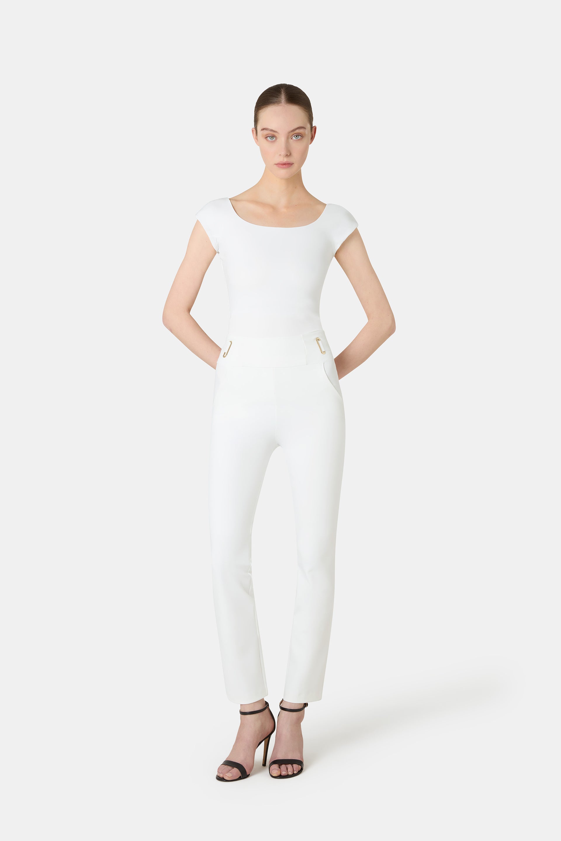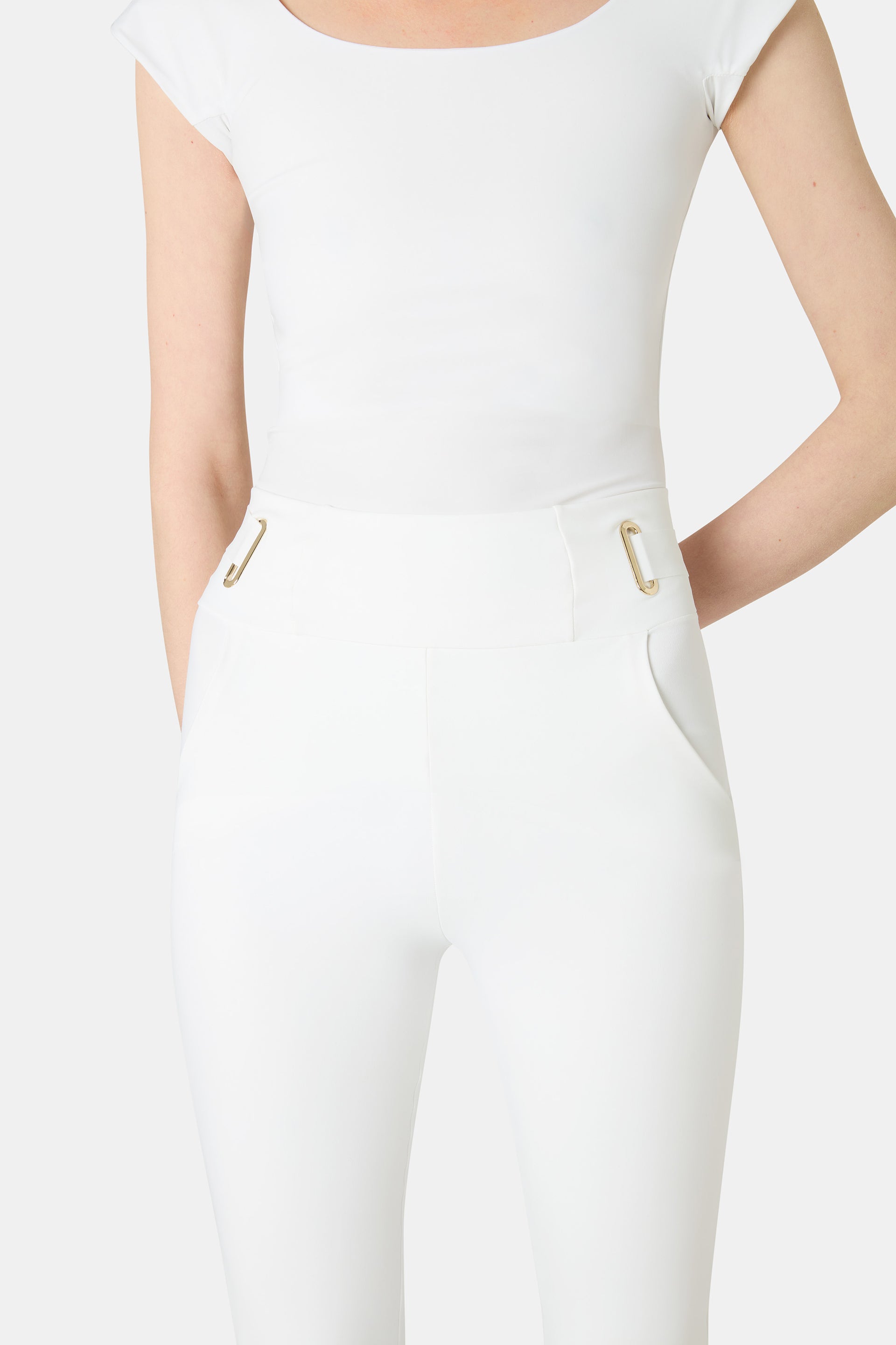 CHIARA BONI's pants are known for their impeccable fit and comfort. Introducing the Damia pants, in a new slim, ankle-length silhouette. An illusion belt at the waist is outlined by metallic loops.