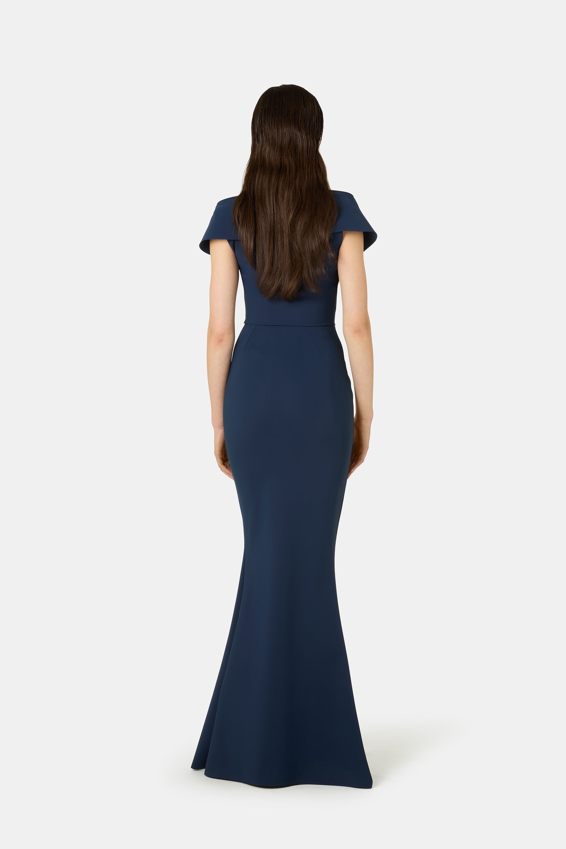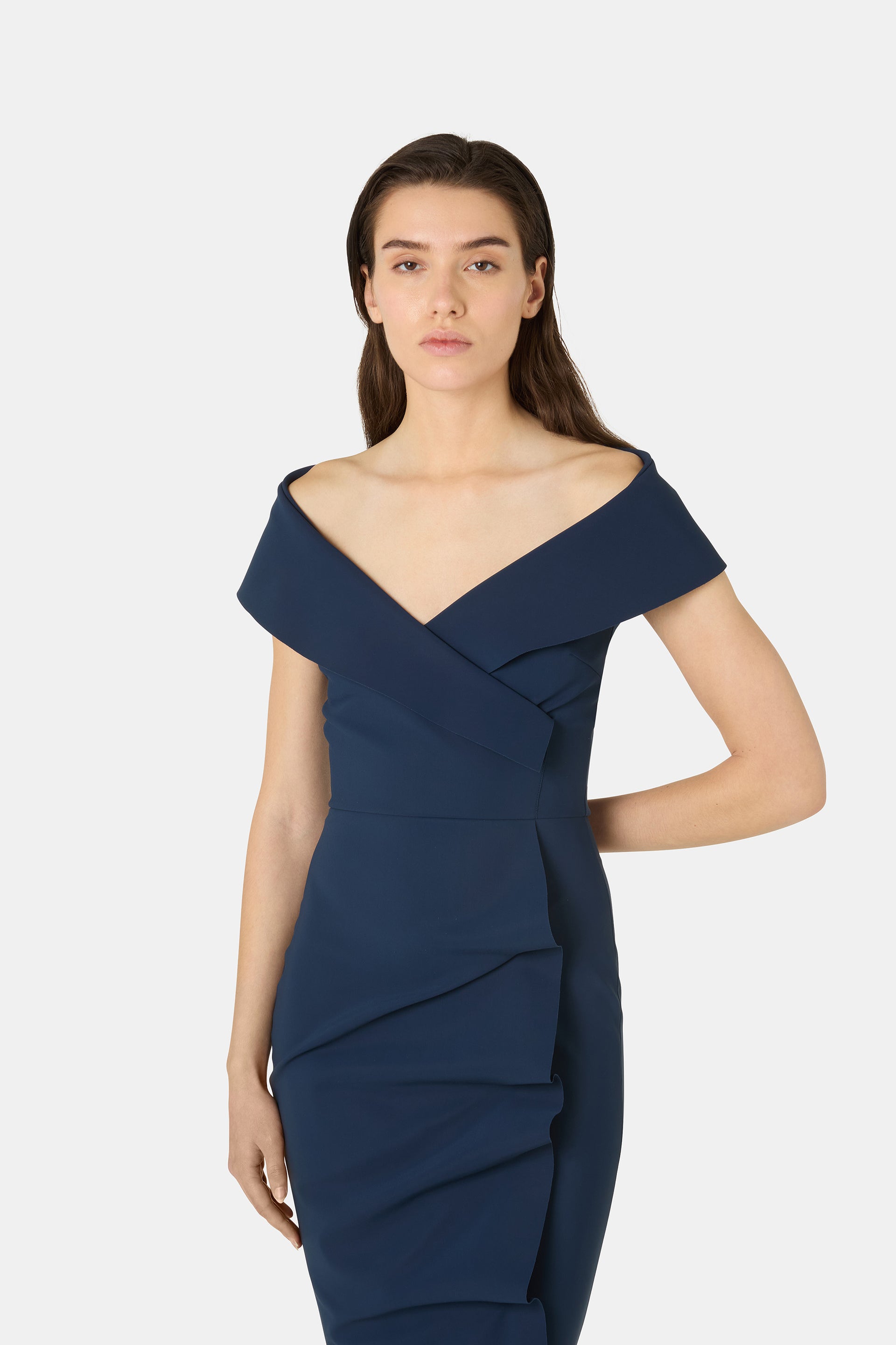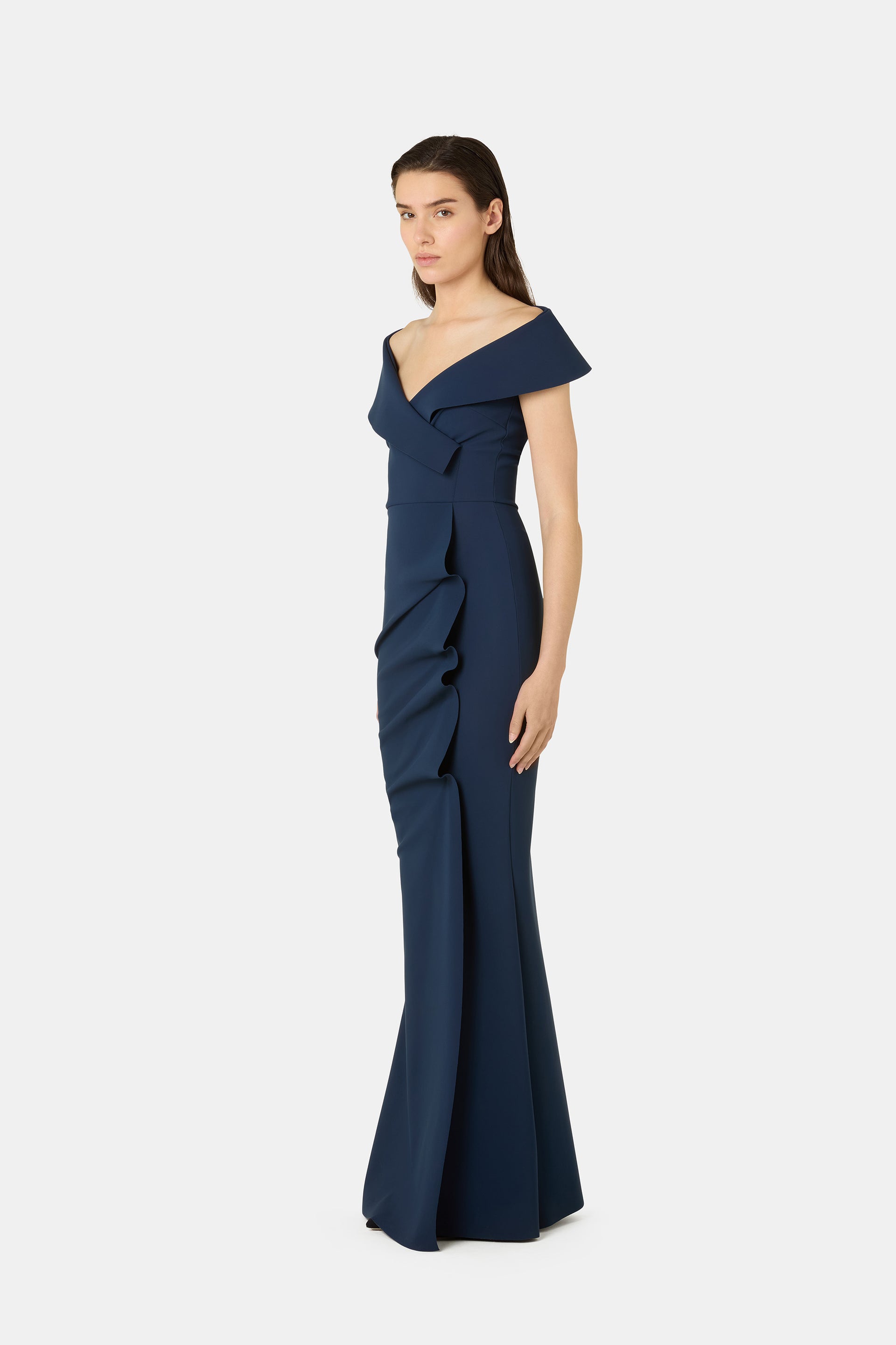 The Fiy gown radiates exceptional elegance in a sophisticated dusk blue shade, featuring delicate draping that gracefully sculpts the natural curves of the silhouette. Its gently off-the-shoulder neckline imparts a refined femininity, while the sleek, flowing cut exudes timeless sophistication. Perfect for special occasions, this dress is the epitome of subtle, polished glamour.