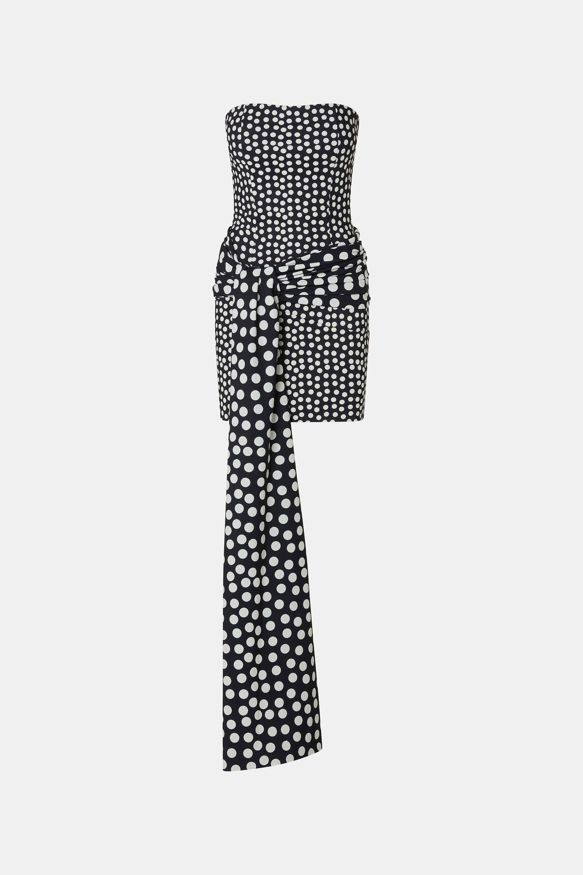 The Gaja dress is a polka-dot mini with modern appeal and an irresistibly cool attitude. Its straight neckline and soft draped waist enhance the silhouette with dynamic movement and a magnetic allure, perfectly embodying the brand’s chic, contemporary vibe.