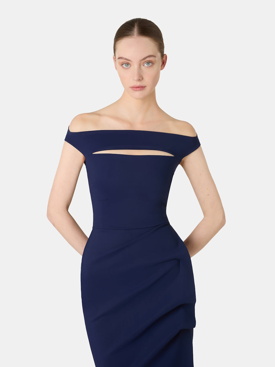 Iconic and a best seller, this midi dress is a true expression of contemporary elegance. The high neckline and fitted silhouette create a refined, sophisticated shape, while the side draping with a structured bow adds character and femininity without excess. A timeless piece designed to enhance the figure and leave a lasting impression—perfect for special occasions and evenings when you want to stand out with style.