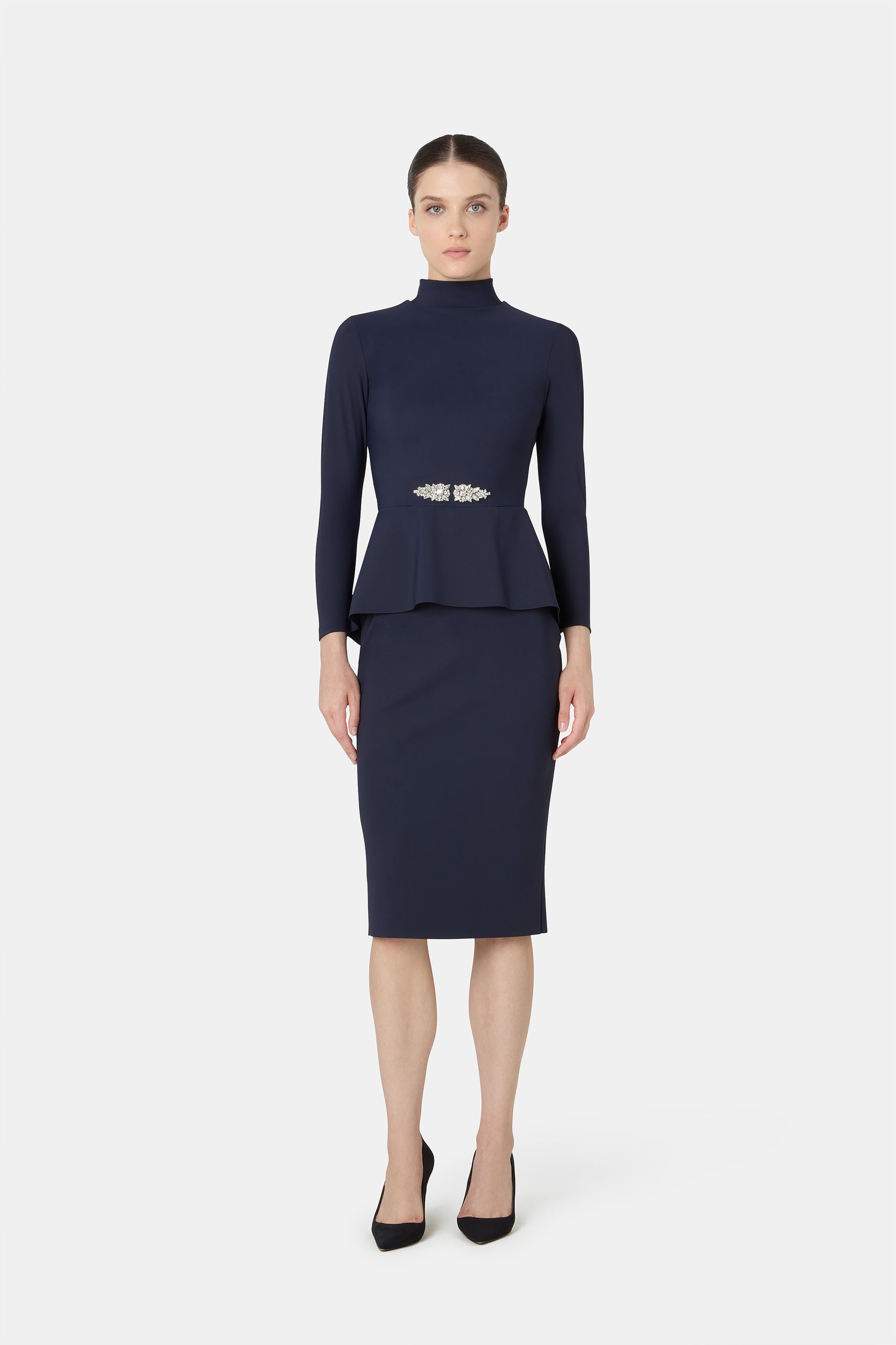 The Haby dress combines modern elegance and simplicity. The peplum at the waist gently defines the waistline, enhanced by a jewel detail. Made of iconic stretch jersey, it sculpts the figure with glamour and style.