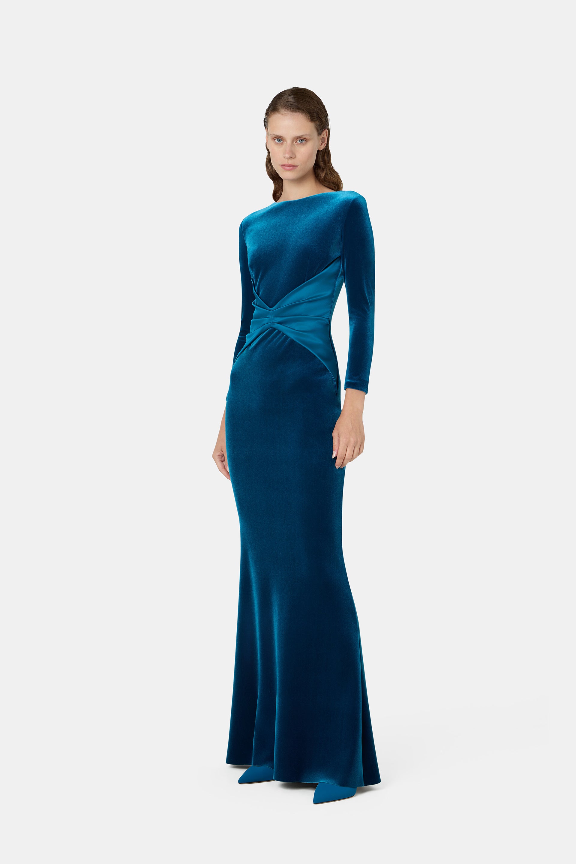The Jaslette gown in Teal Blue velvet embraces the silhouette with an intense yet delicate touch, perfect for the most elegant winter evenings. Long sleeves and a satin detail at the waist come together in a sophisticated design, enhanced by the refined and vibrant new Teal Blue shade. A piece that turns every movement into a moment of pure magic.