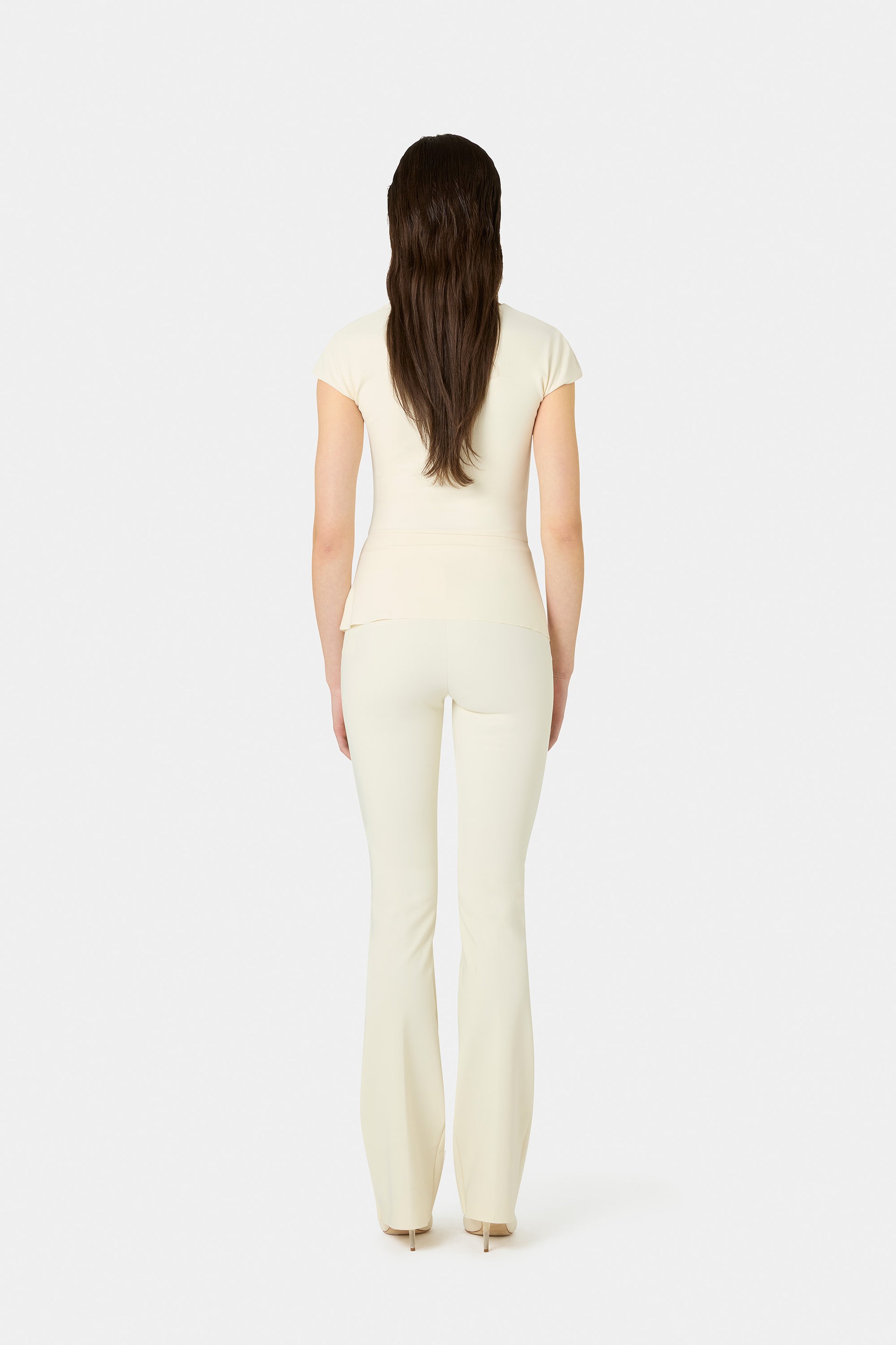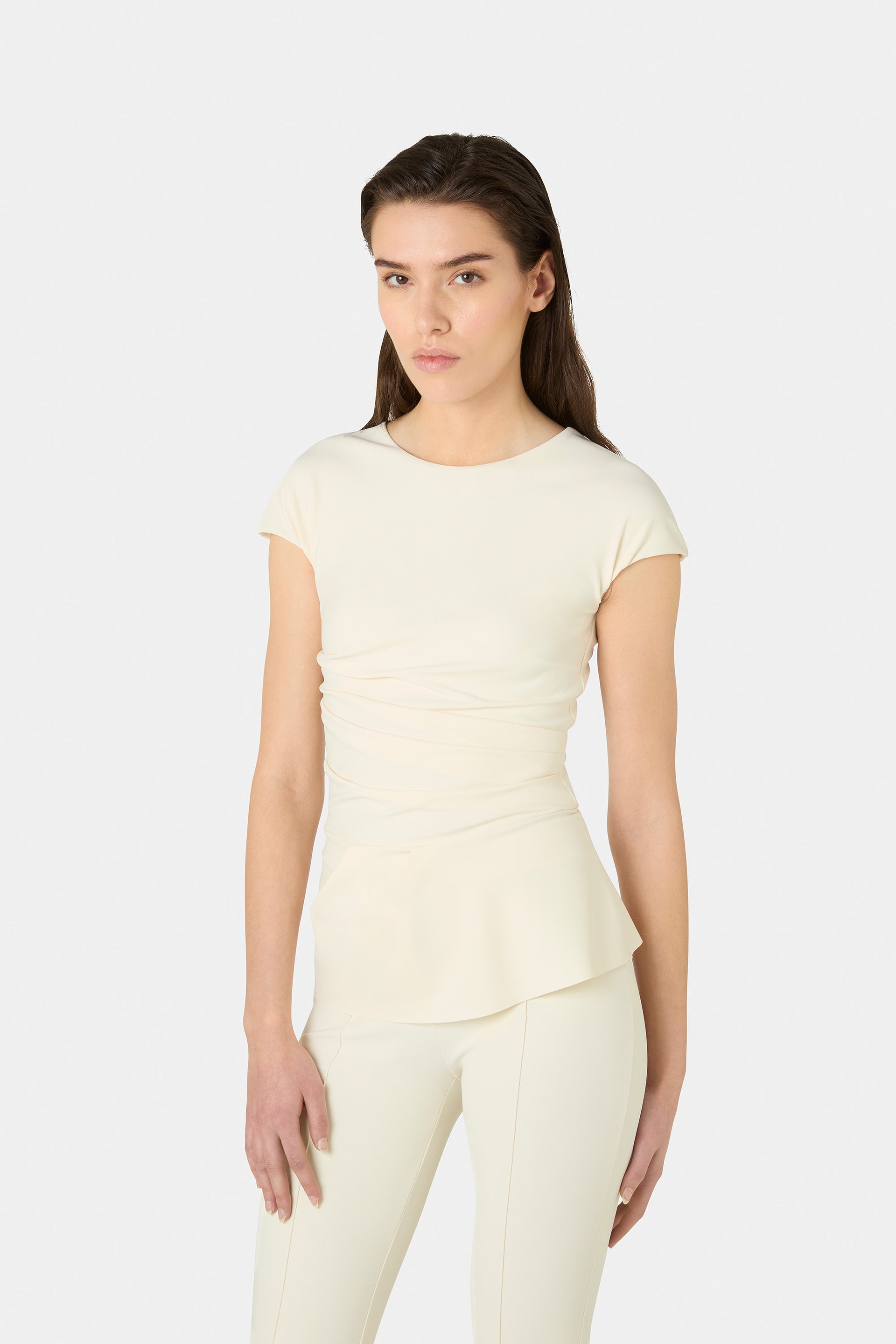 The Lisai top, crafted from lightweight jersey, features a round neckline, short sleeves, and waist detailing that creates a crossover effect. Perfect to pair with seasonal trousers or wear under a jacket. The slightly flared hem adds a refined touch to your summer looks.