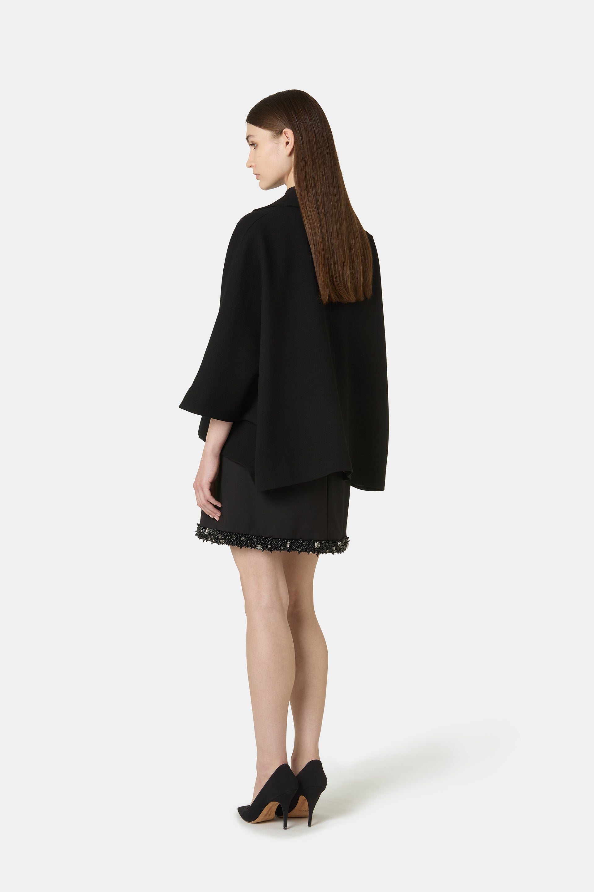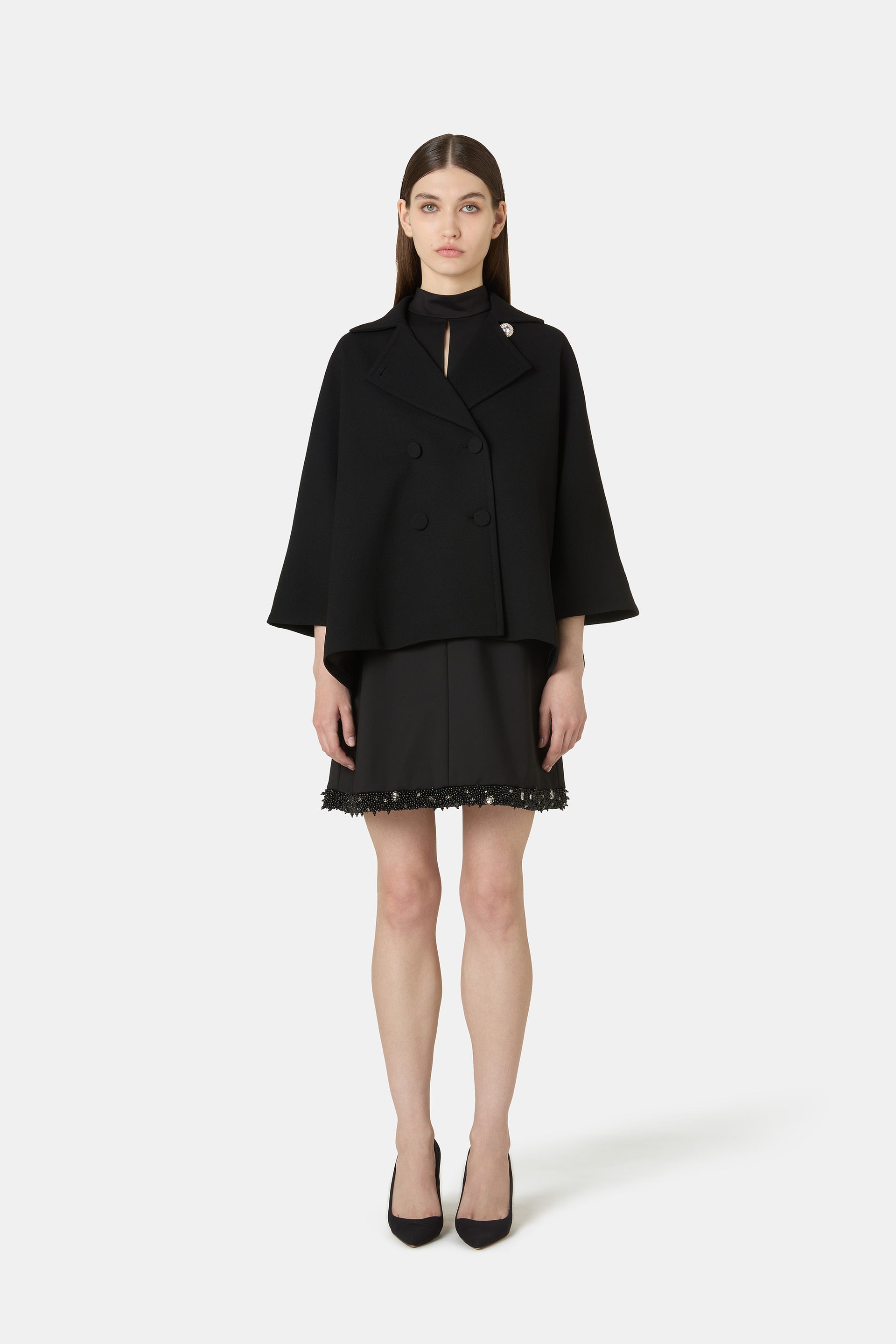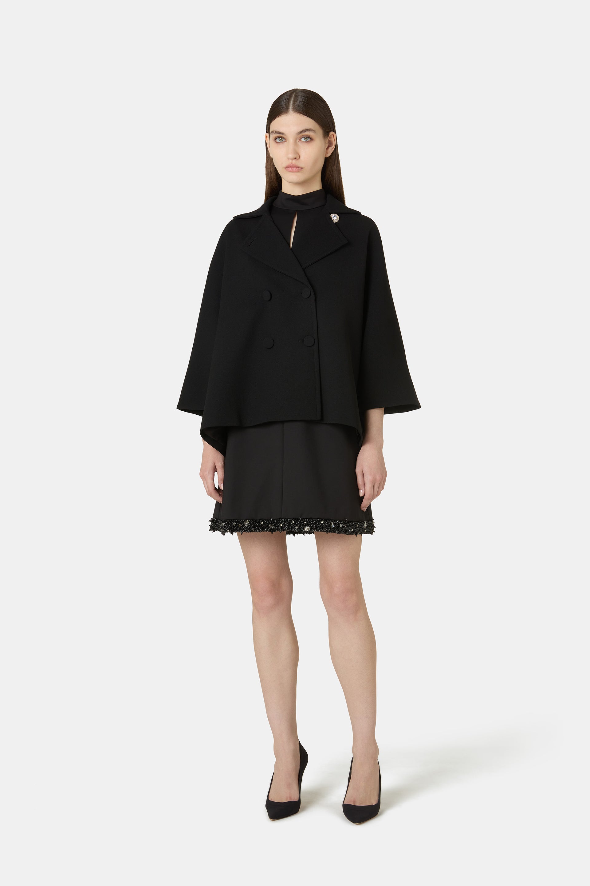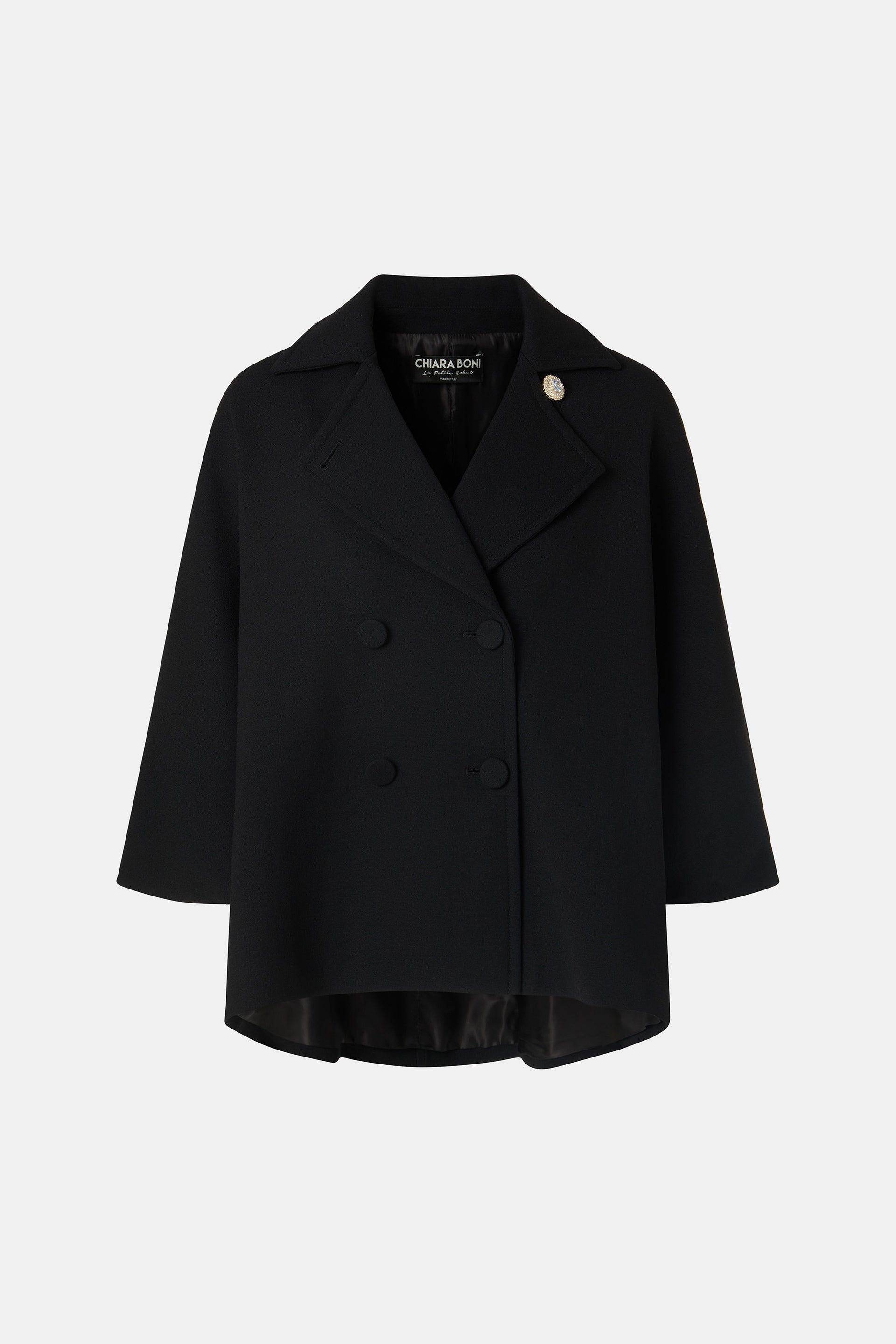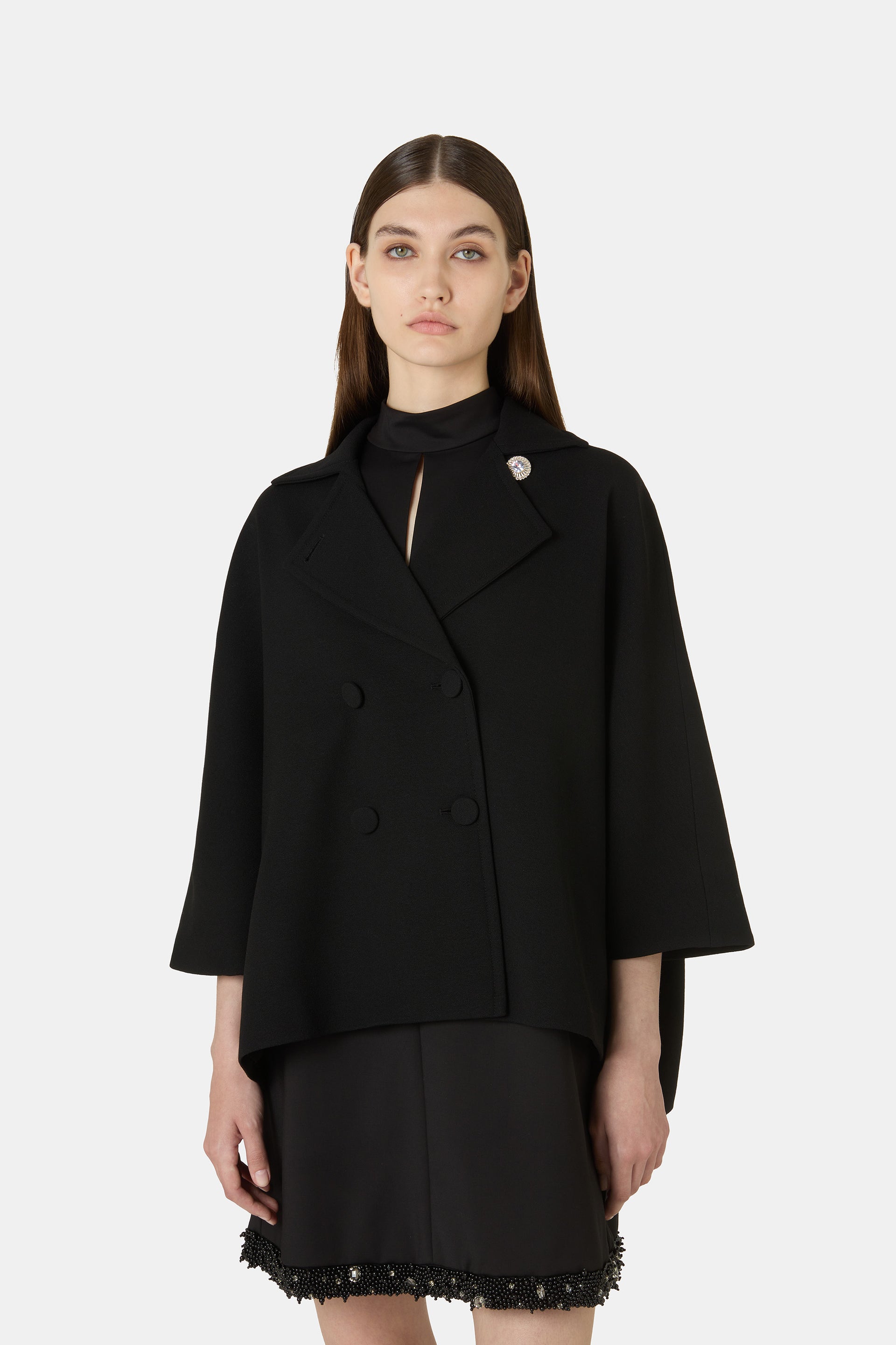 The coat alternative for the season is our elegant and modern Livre cape featuring a double-breasted cut and wide sleeves. The bejeweled button on the left side and the quadruple button fastening give it an exclusive feel.