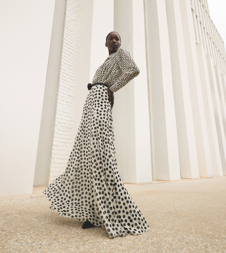 The Spring/Summer 2026 collection looks to Hollywood’s Golden Age, reinterpreting its timeless elegance with a modern and deeply feminine perspective. Essential, enveloping lines meet a palette of delicate shades, while brooches, metallic embroidery, and luminous details evoke vintage jewelry, enriching drapes and graphic silhouettes. A collection that celebrates charm, confidence, and femininity, with a cinematic yet contemporary allure.