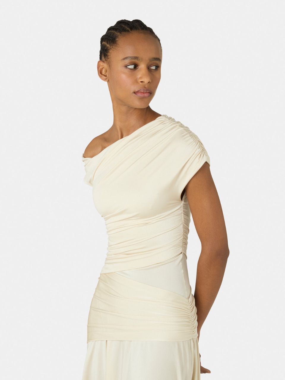The Spring/Summer 2026 collection looks to Hollywood’s Golden Age, reinterpreting its timeless elegance with a modern and deeply feminine perspective. Essential, enveloping lines meet a palette of delicate shades, while brooches, metallic embroidery, and luminous details evoke vintage jewelry, enriching drapes and graphic silhouettes. A collection that celebrates charm, confidence, and femininity, with a cinematic yet contemporary allure.