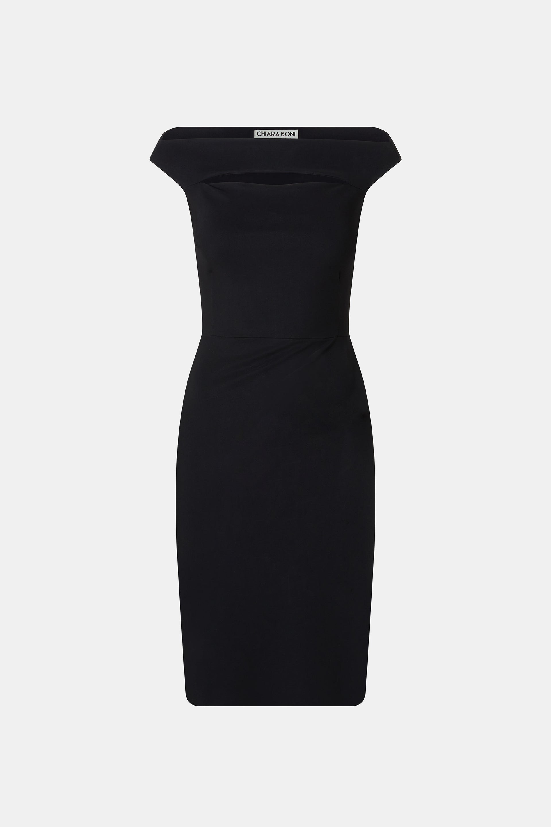 A Chiara Boni classic. The Melania dress is instantly recognizable, with a distinctive straight neckline with a horizontal cut-out across the décolleté, and elegantly draped skirt. A versatile dress suited for any occasion, day or night.