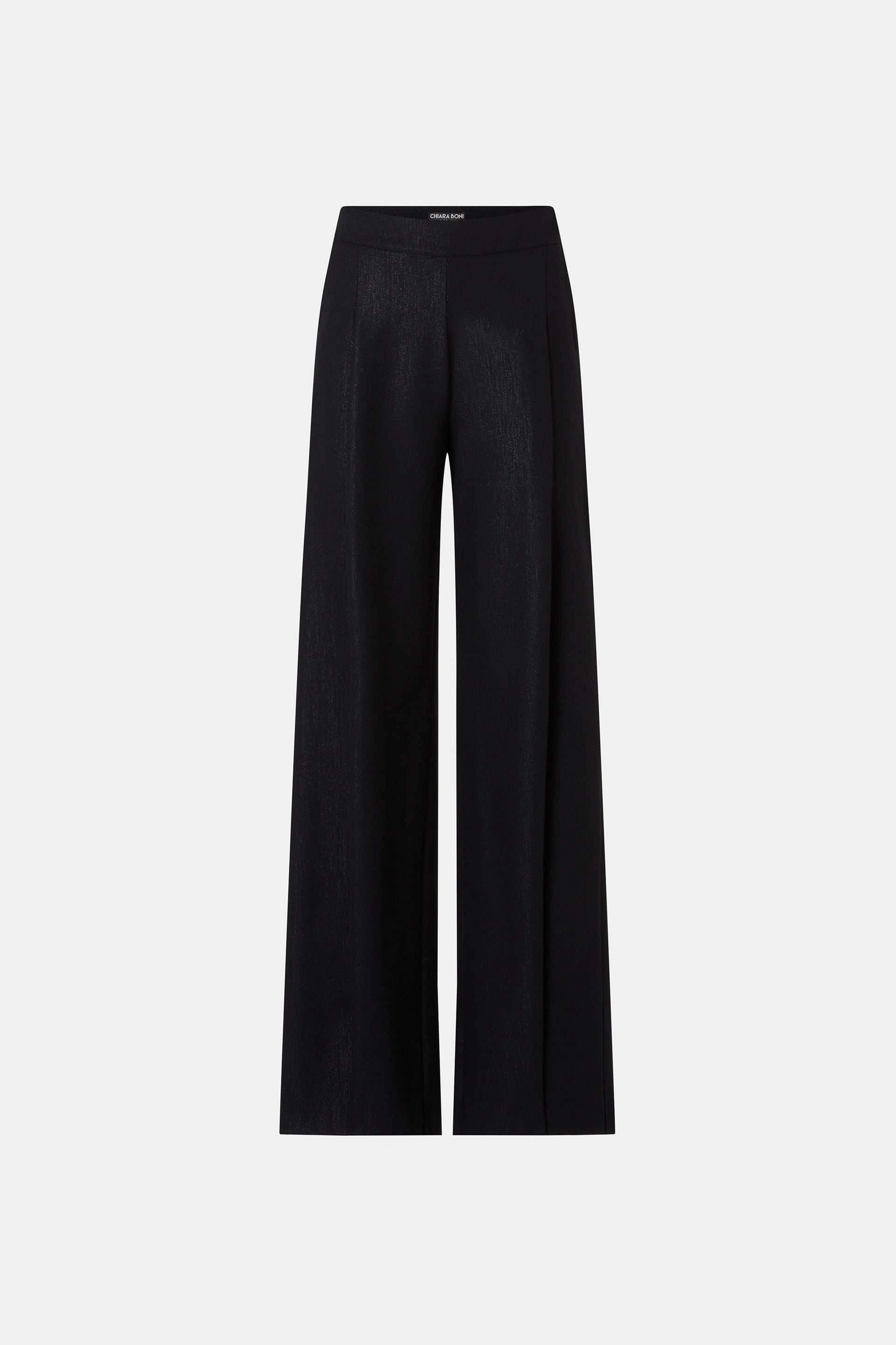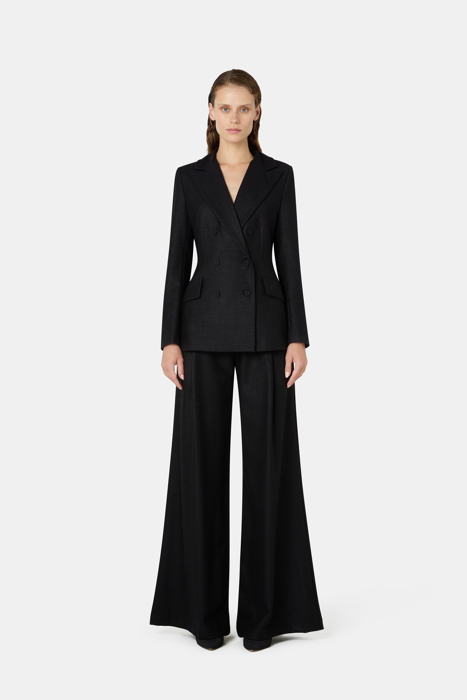 The tailored elegance of the Sobres wide-leg wool trousers stands out for its modern and sophisticated charm. The shimmering texture adds a glamorous accent to their classic construction. Pleats at the waist sculpt the silhouette with precision, evoking a masculine-inspired tailoring reinterpreted with a contemporary twist. Designed to be worn with the matching blazer, they are a statement piece of effortless refinement.