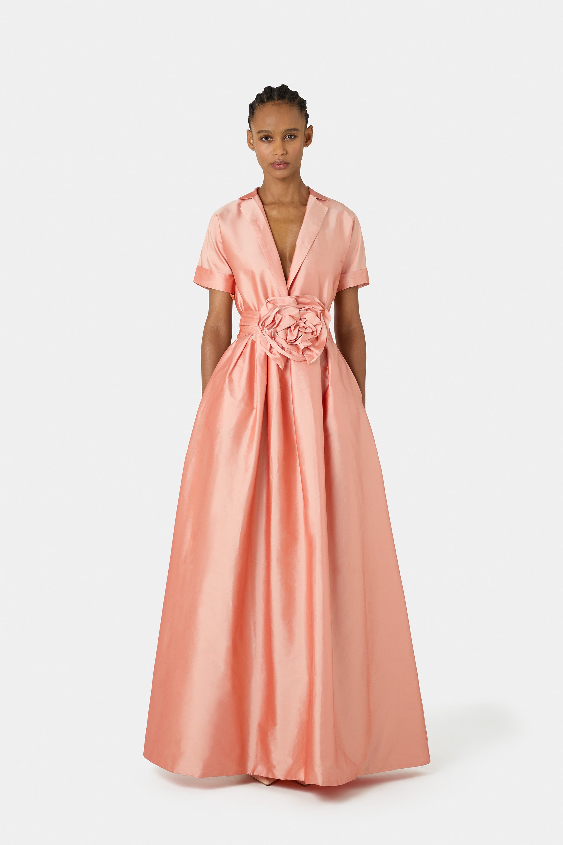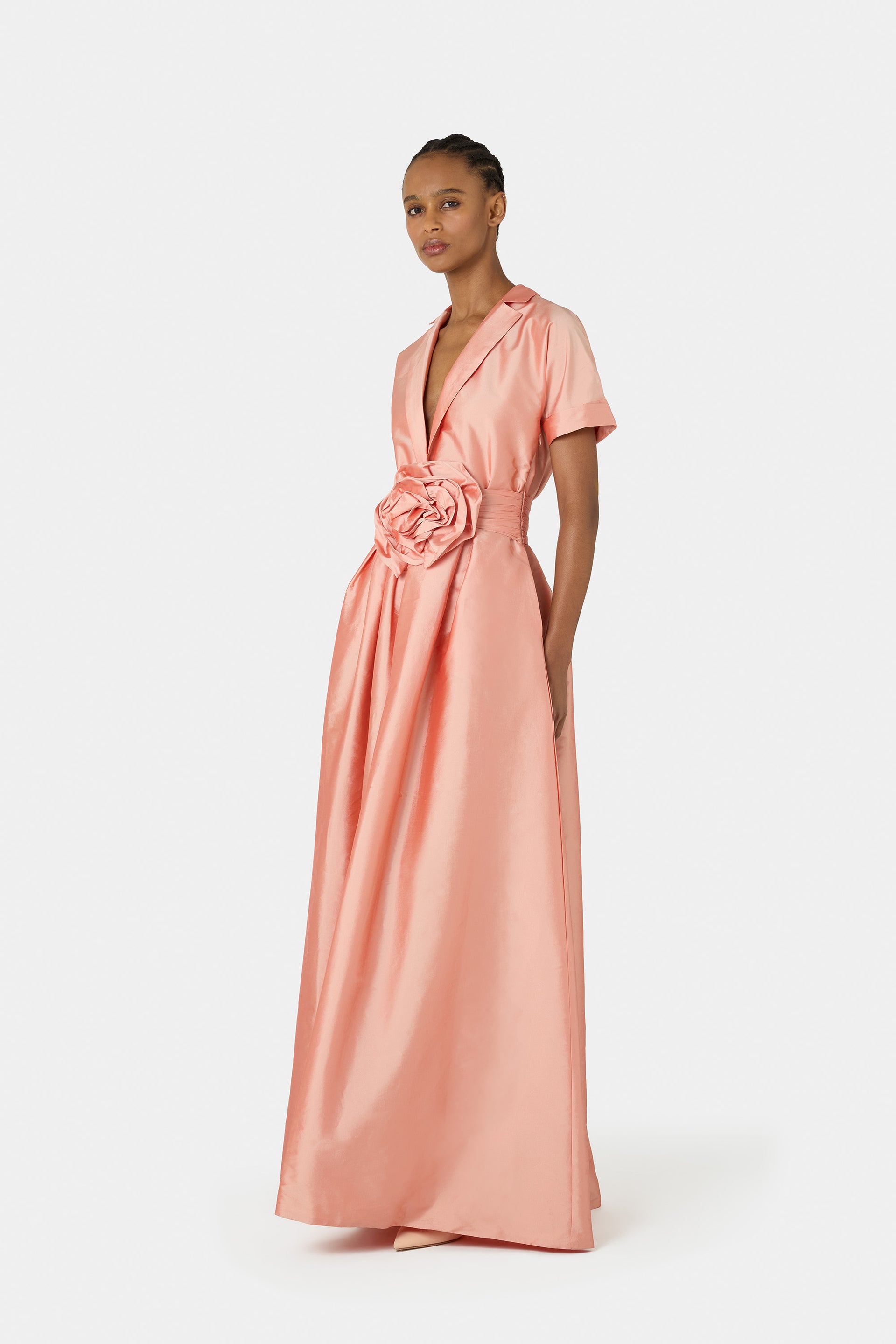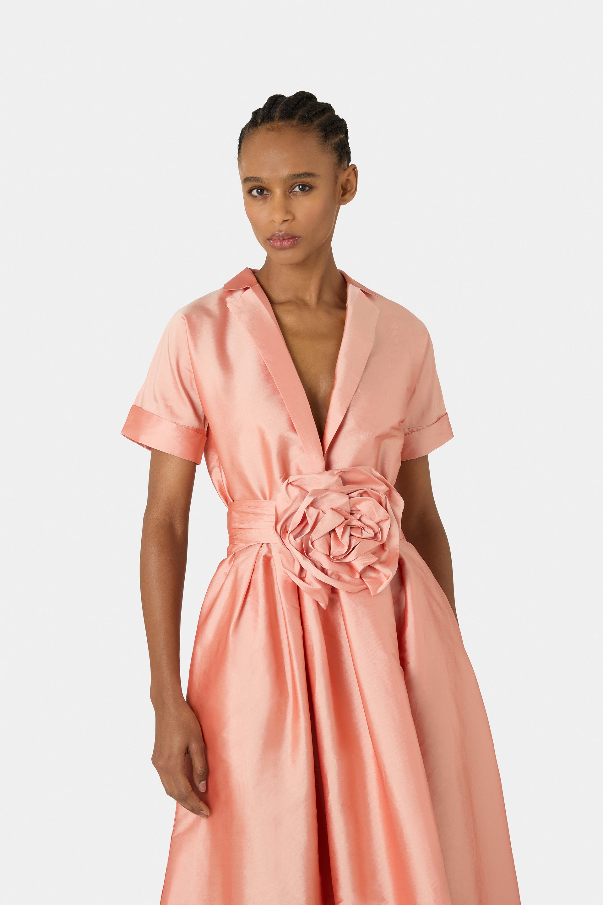 The Stoya dress in taffeta exudes a dramatic and irresistibly feminine charm. Featuring short sleeves and a refined V-neckline, it is cinched at the waist with a belt adorned by a large floral appliqué that delicately captures attention. A sophisticated creation, perfect for those seeking a striking look full of elegance and grace.